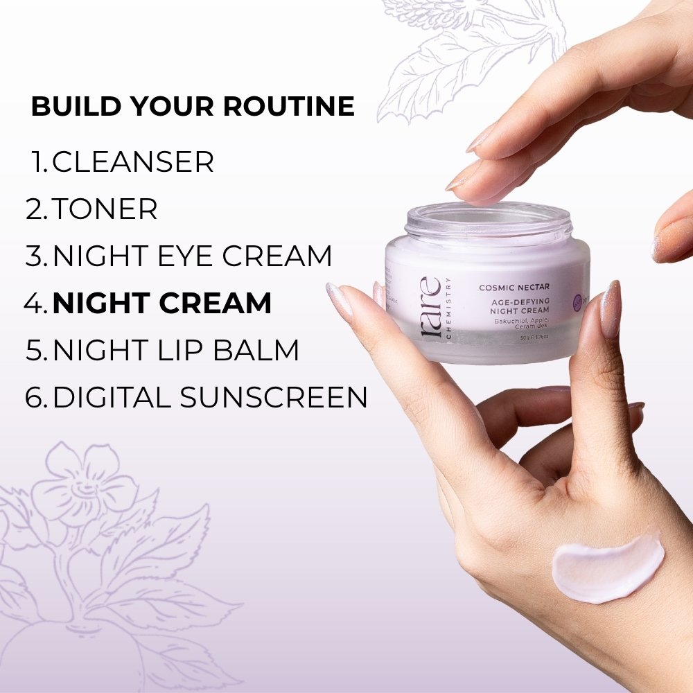 Enriched with a rare blend of bakuchiol, apple and ceramides our Age Defying Night Cream works wonders as you sleep. Bakuchiol’s nourishing factors smoothen fine lines, wrinkles and reverse oxidative damage. Apple have natural exfoliating factors that promote even complexion while ceramides help restore and retain the skin’s natural lipid barrier for firm, youthful and healthy skin.