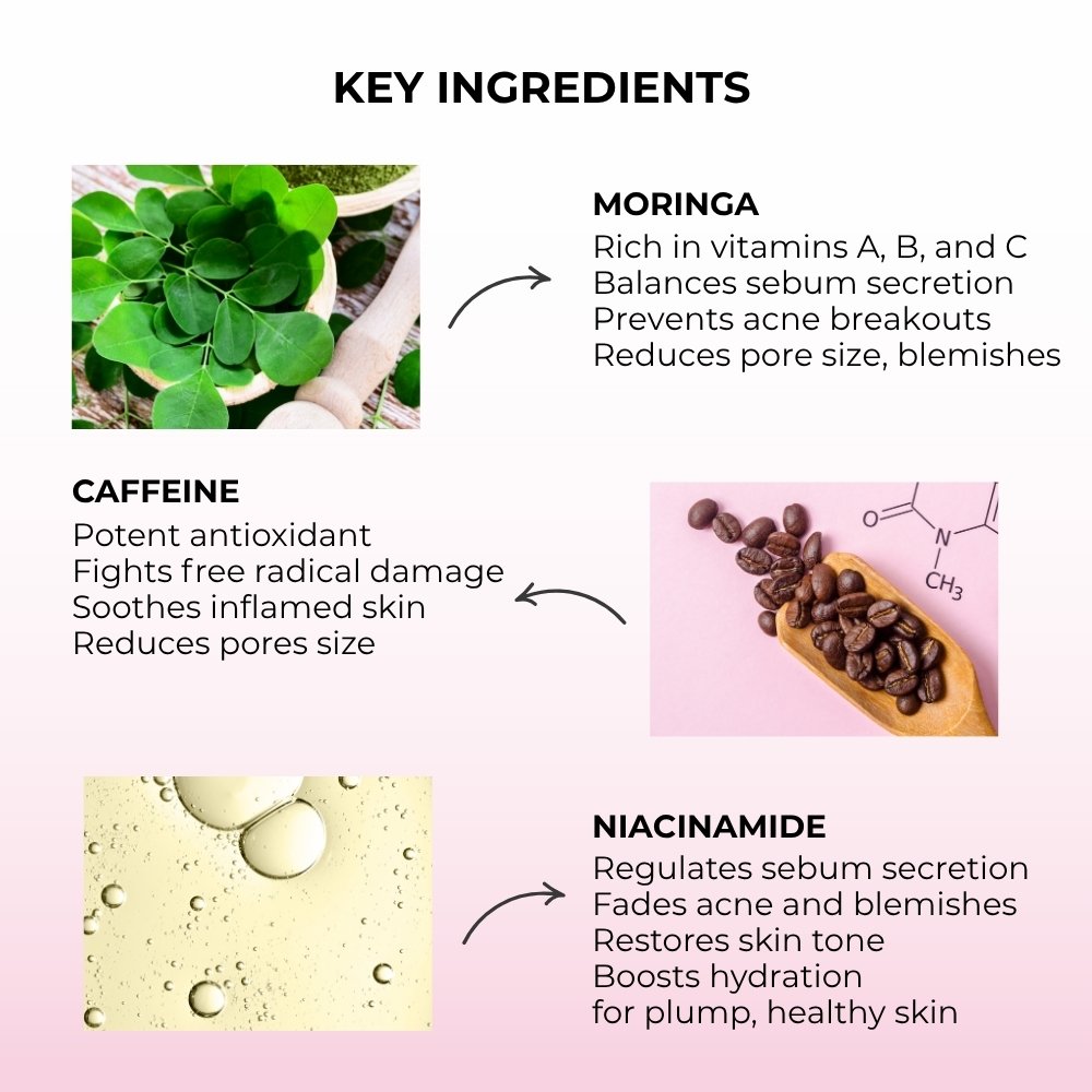 Rich in vitamin A, B and C, moringa helps clear blackheads, acne and blemishes by minimizing enlarged pores and regulating the skin’s sebum secretion. Its anti-inflammatory nature soothes the skin from redness and boosts collagen for healthy, glowing skin.
