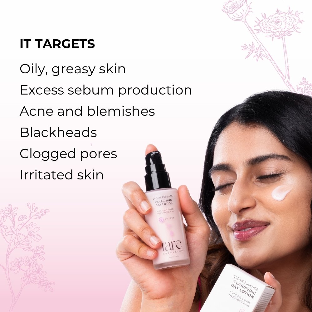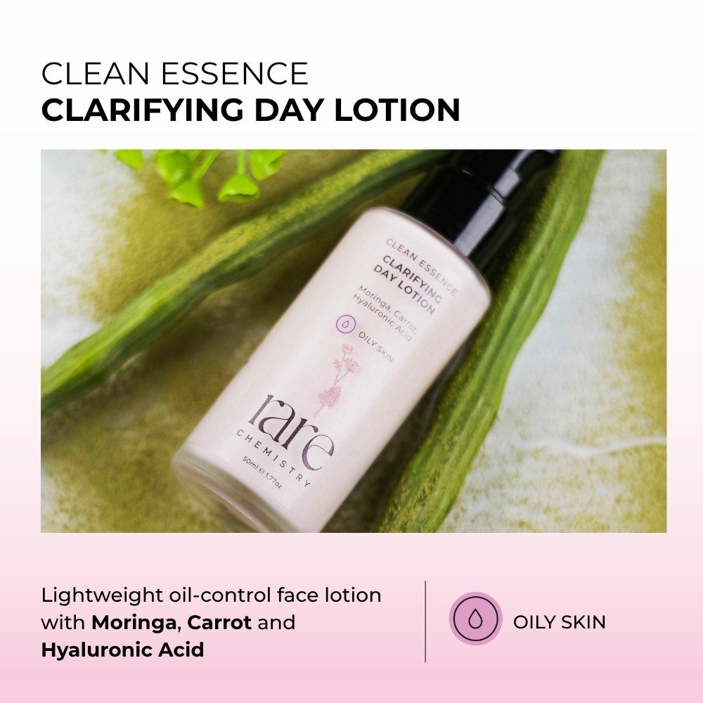 An ultimate blemish fix for oily and adolescent skin formulated with a rare blend of botanicals and hyaluronic acid. Our Clarifying Day Lotion is a powerful potion that harnesses the anti-inflammatory and natural acne preventing properties of moringa, the cell-regenerating abilities of carrot along with the hydrating and healing properties of hyaluronic acid. With a dewy finish, this lotion is a must have for anyone looking for blemish-free and balanced skin.