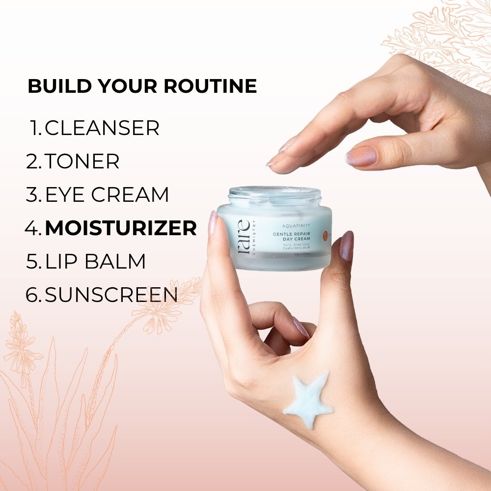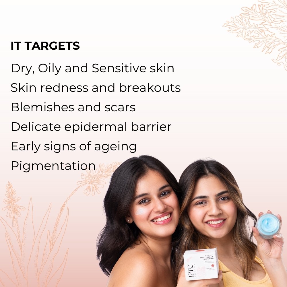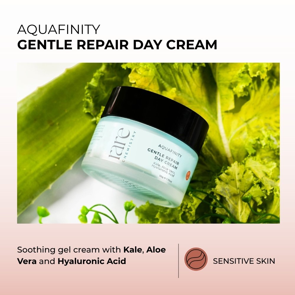 Discover the ultimate solution for sensitive skin with our Gentle Repair Day Cream that moisturizes, calms and restores the delicate epidermal barrier. This exquisite formula with antioxidant rich kale fight inflammation, promote collagen production along with aloe vera that reduces redness and irritation. Hyaluronic acid further adds to the goodness of this product by strengthening the skin’s natural lipid barrier for calm, smooth and healthy complexion.