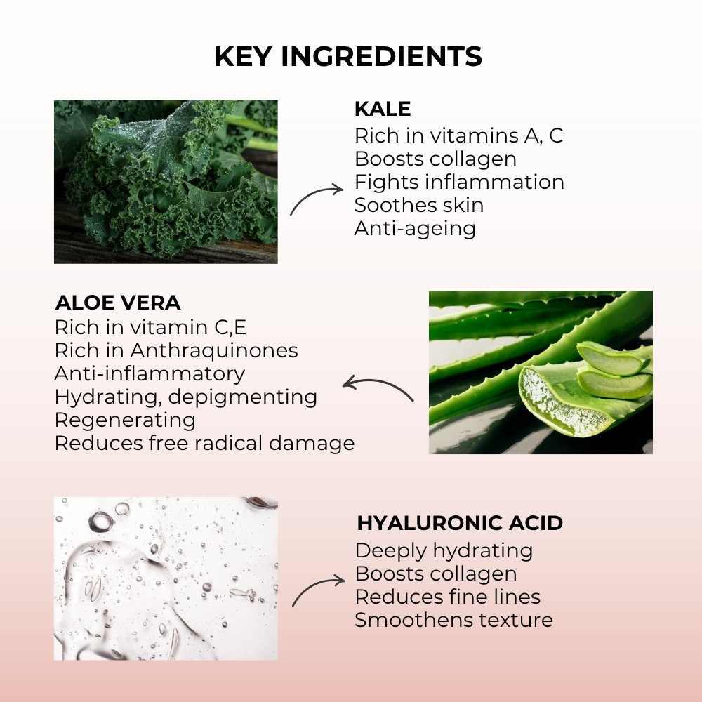 With high concentrations of vitamin A, C and antioxidants, kale works wonders on the skin. It promotes collagen production and fights inflammation making it perfect for sensitive, delicate skin.
