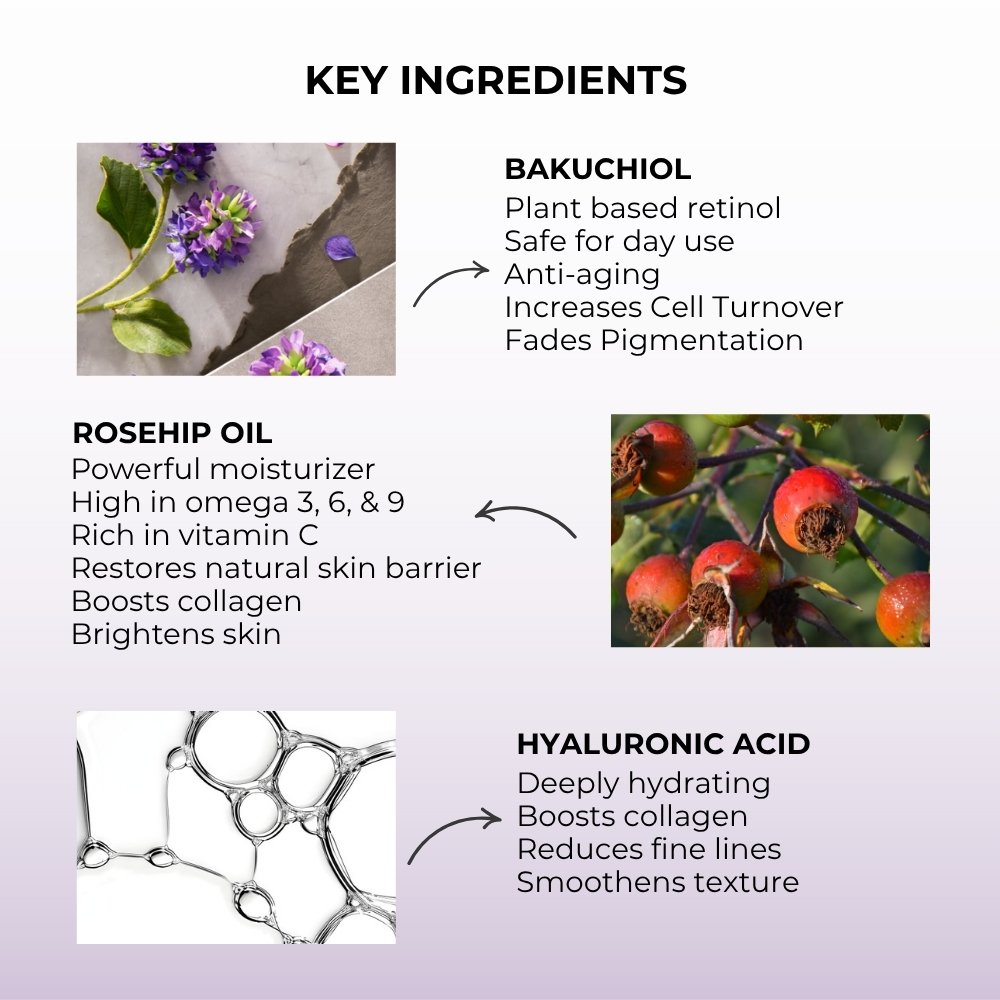 Ingredients: Solanum tuberosum 2% (potato fruit water), Cocos nucifera 2% (coconut fruit milk), Prunus amygdalus 2% (almond seed oil), Rosa centifolia 1% (rosehip fresh bud oil), Psoralea corylifolia 0.25% (bakuchiol seed oil), Vaccinium macrocarpon 0.25% (cranberry). Other Ingredients: Hyaluronic acid, Niacinamide, Sea buckthorn, Ceramide 3, Ammonium lactate, Myristic acid, Coco stearic acid, Glycerine, Aqua