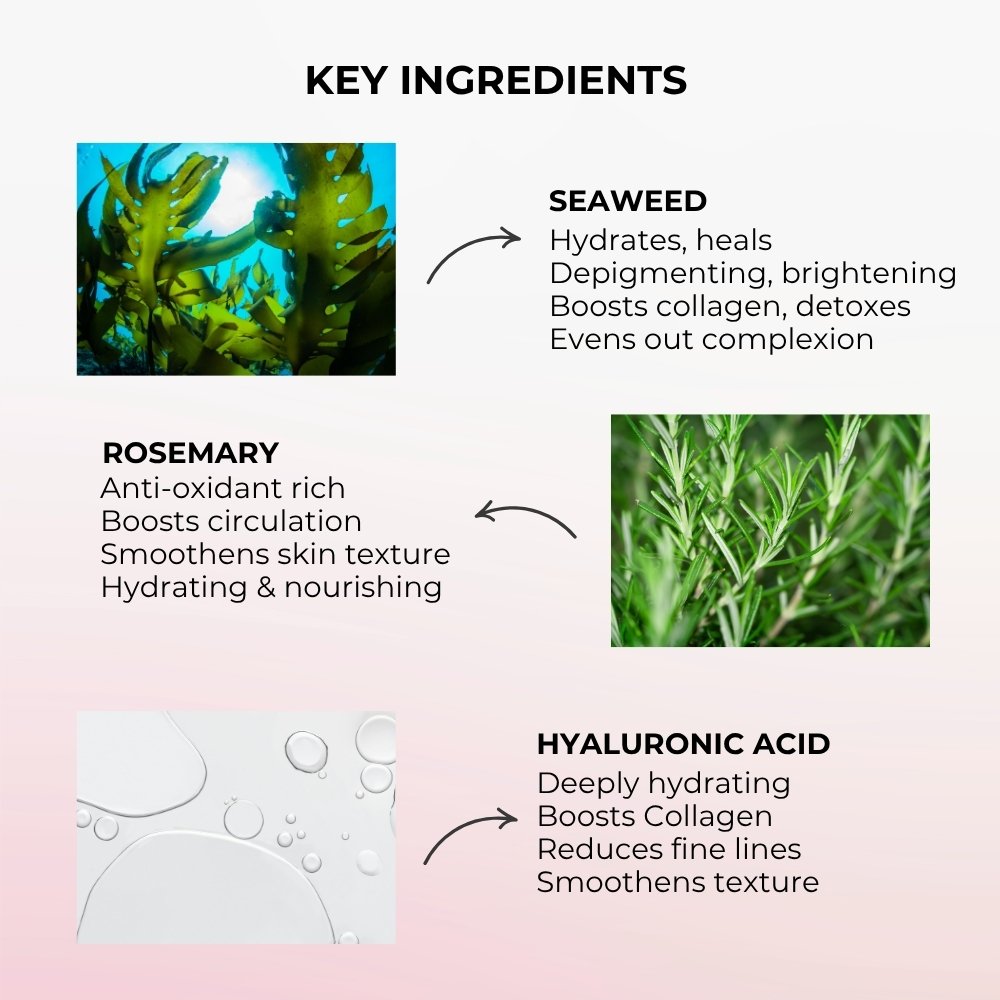 A skincare powerhouse, seaweed offers hydration and skin healing properties. It stimulates collagen production, aids detoxification by gently exfoliating the skin. Additionally, it effectively reduces hyperpigmentation and suits all skin types.